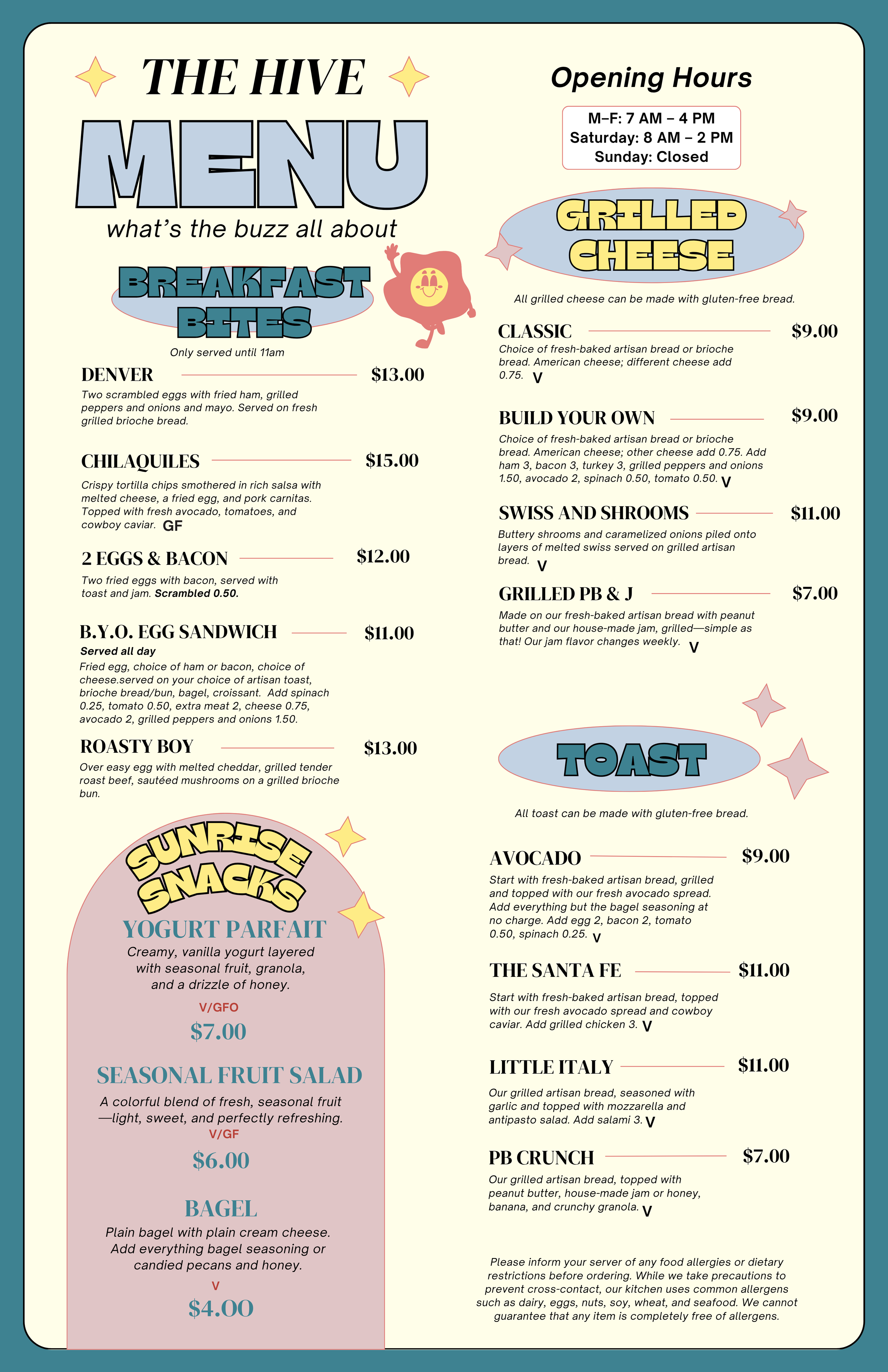 At The Hive Coffee & Bakehouse, every sip and bite is crafted with care. Explore our menu filled with delightful drinks, sweet treats, and savory bites—all made to keep you buzzing through your day.