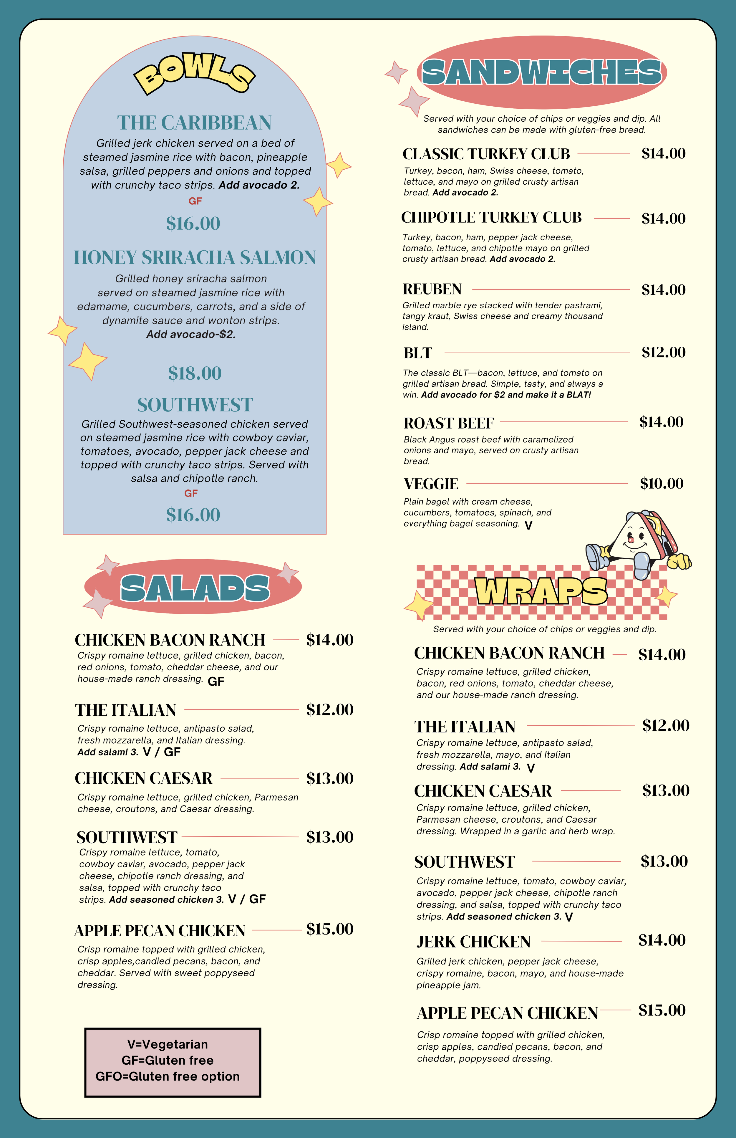 Fuel your day with our fresh and satisfying breakfast and lunch options. Kick off your morning with our hearty egg sandwiches or perfectly prepared avocado toast. For lunch, dive into flavorful wraps, vibrant salads, and wholesome bowls, all made with fresh, high-quality ingredients. Whether you’re in the mood for something light or hearty, our menu has just what you need to keep you buzzing throughout the day.